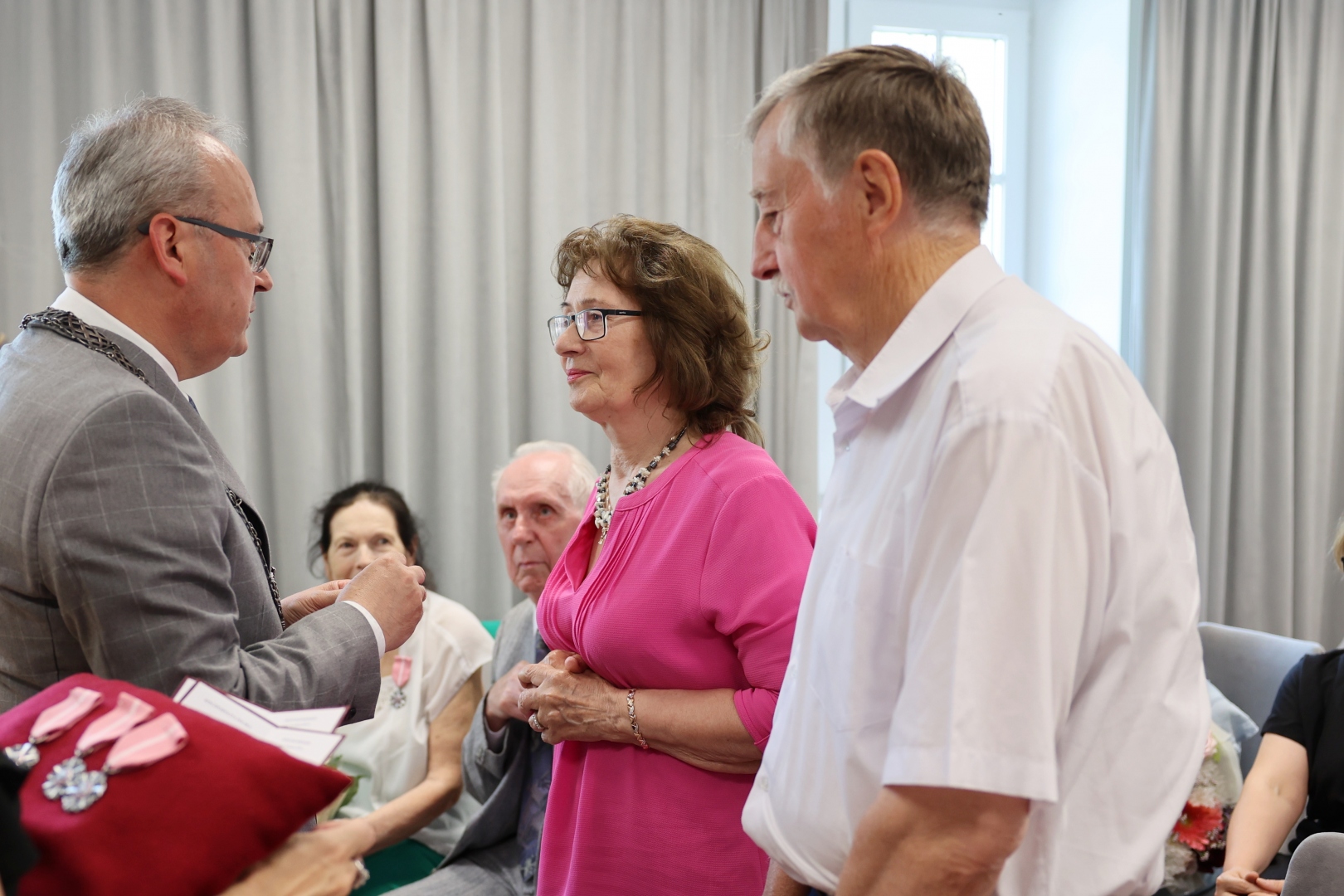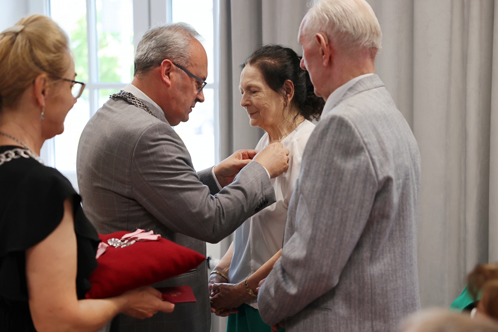 Kolejne medale za długoletnie pożycie małżeńskie wręczone. W Urzędzie Stanu Cywilnego odbyła się ceremonia uhonorowania mieszkańców naszego miasta. W uroczystości uczestniczyły 3 pary Jubilatów. W tym ważnym dniu nie mogło zabraknąć też ich najbliższe rodziny. Medale w imieniu Prezydenta Rzeczypospolitej Polskiej wręczył Burmistrz Augustowa Mirosław Karolczuk.