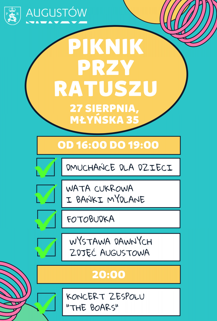 Znamy przepis na rozpoczęcie weekendu! W piątek 27 sierpnia zapraszamy wszystkich augustowian na wydarzenie specjalnie dla Was. Co planujemy? Najpierw o godzinie 12 oficjalne otwarcie urzędu z udziałem samorządowców, radnych obecnej i poprzednich kadencji oraz oficjalnych delegacji. Później, od godziny 16 piknik przy ratuszu. Na najmłodszych mieszkańców naszego miasta czekać będą dmuchańce do zjeżdżania i skakania, kolorowa wata cukrowa i fotobudka oraz bańki mydlane. Zależnie od pogody piknik potrwa do 18 lub 19.