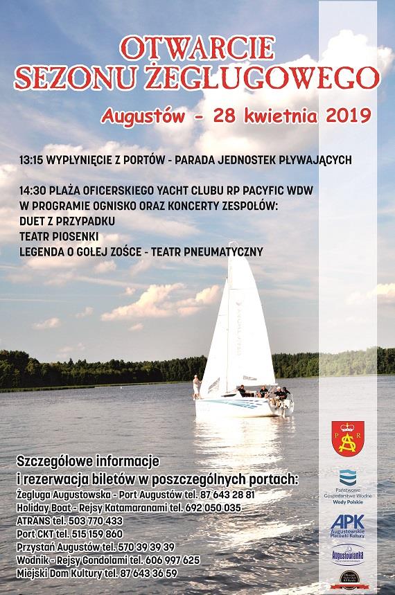 Wysłane przez Ewa Mickiewicz, 11/04/2019Augustowskie Placówki Kultury i Państwowe Gospodarstwo Wody Polskie serdecznie zapraszają na niecodzienny rejs do Gołej Zośki. W ramach otwarcia tegorocznego sezonu żeglugowego w niedzielę 28 kwietnia na augustowskie wody wypłyną niemal wszystkie rodzime jednostki pływające. Statki, katamarany i gondole zabiorą Państwa w inauguracyjny rejs o godz. 13:15. O tej godzinie na rzekę Nettę wyruszy wielka parada jednostek pływających. Bilety na rejsy dostępne w poszczególnych portach.