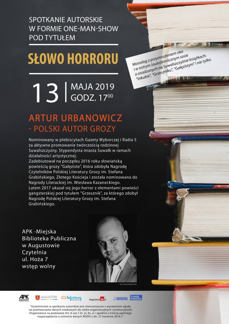 Wysłane przez Ewa Mickiewicz, 08/05/2019W poniedziałek, 13 maja, o godzinie 17:00 w Czytelni Miejskiej Biblioteki Publicznej w Augustowie przy ul. Hożej 7 odbędzie się spotkanie z pisarzem Arturem Urbanowiczem - autorem cenionych i nagradzanych powieści osadzonych na Suwalszczyźnie i Augustowszczyźnie: "Gałęziste" (Złoty Kościej), "Grzesznik" (Nagroda Polskiej Literatury Grozy im. Stefana Grabińskiego) i "Inkub". Autor był również nominowany w plebiscytach Gazety Wyborczej i Radia 5 za aktywne promowanie twórczością rodzinnej Suwalszczyzny i został stypendystą miasta Suwałk w ramach działalności artystycznej.